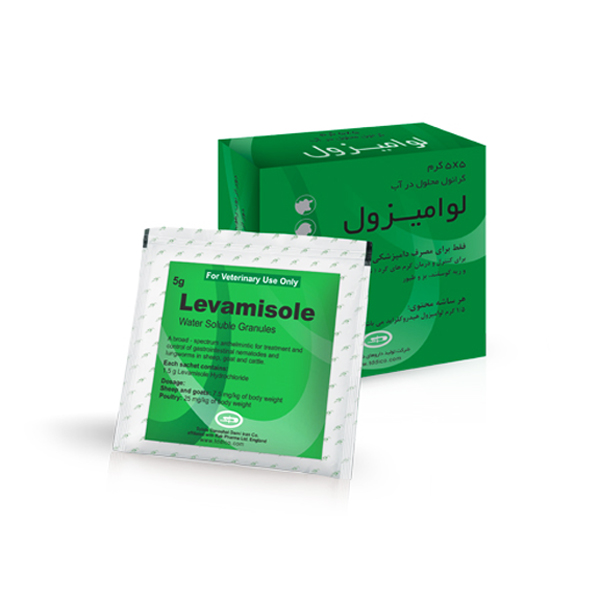 طيور: 500 میلی گرم لوامیزول هیدروکلراید به ازای هر کیلوگرم وزن بدن یک ساشه 5 گرمی